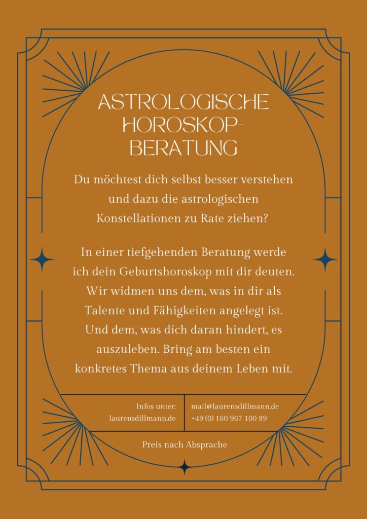 Ich beschäftige mich seit über zehn Jahren autodidaktisch mit Astrologie. Ursprünglich als „Königin der Wissenschaften“ bezeichnet, ist sie eine symbolische Sprache und geistige Disziplin, die hilft, das eigene Wesen tiefer zu verstehen. Astrologie eröffnet Räume für Selbsterkenntnis, Orientierung und Entwicklung und zeigt uns: Es gibt „da oben“ mehr als das, was unser Alltagsbewusstsein erfassen kann.